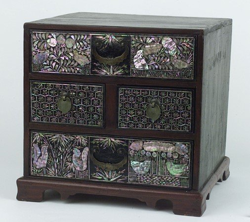 Mother-of-pearl is decorated on the lid and all four sides except for the bottom