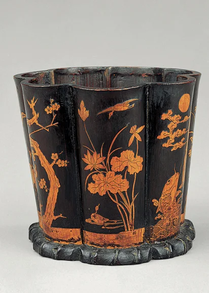 Used to store rolls of paper, short paper bins could be set atop a document chest or bookcase. This one is made from seven halved stalks of bamboo, which were joined together in the shape of a flower.