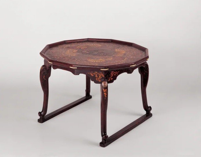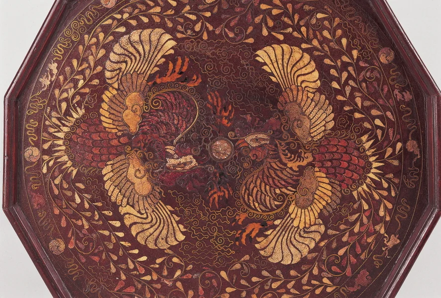 In the style of Baekgol Soban, the entire soban, made of pine, was painted with vermilion. The top plate has 12 angles, resembling a Hojokban (虎足盤). The top plate is adorned with two phoenixes, their wings outstretched. Surrounding the beacon fire and the frame, it is finished with two twisted copper wires and a Taegeuk pattern crafted from fish skin. On the lower side of the top plate, a floral pattern was placed, along with a Taegeuk pattern made from fish skin and a Bagua pattern. This piece dates back to the late 19th century, with dimensions of H 41,4 cm and a diameter of 65 cm.