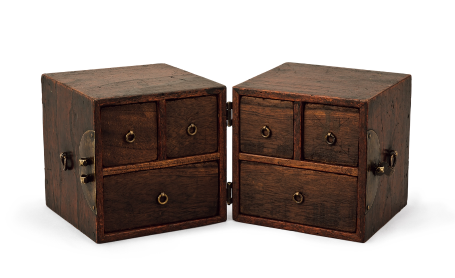 Two large doors open to reveal a series of small drawers for medicinal herbs and products.