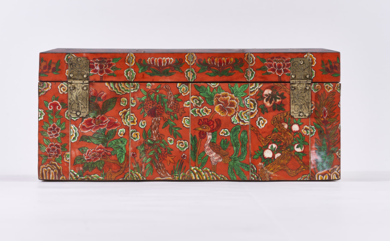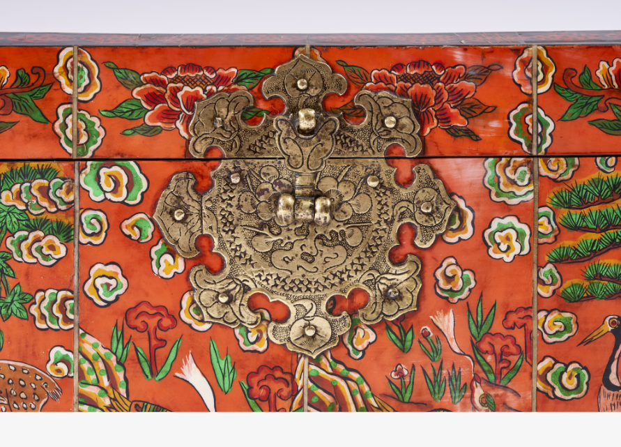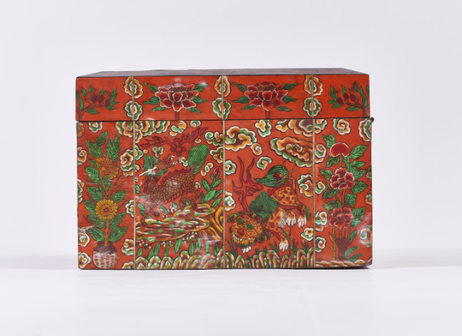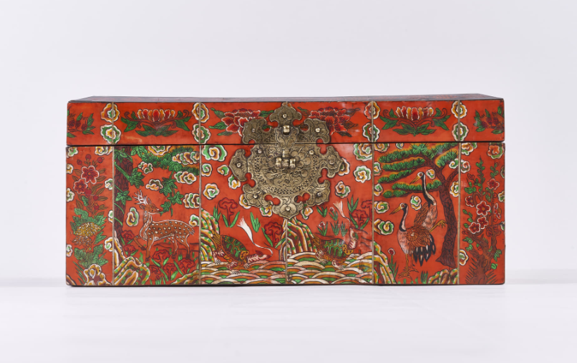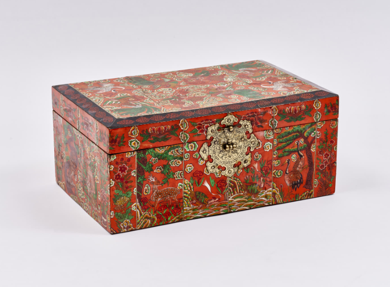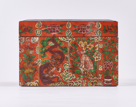 4 Photos above: Box with Design of Auspicious Symbols. Deer, monkey, dragon, tiger, crane, phoenix, peony, clouds, etc. are decorated with engravings on a red background. Korean paper is pasted inside the box. H. 21,5cm, W. 42,5cm, D. 17cm. Collection: National Folk Museum, Seoul.
