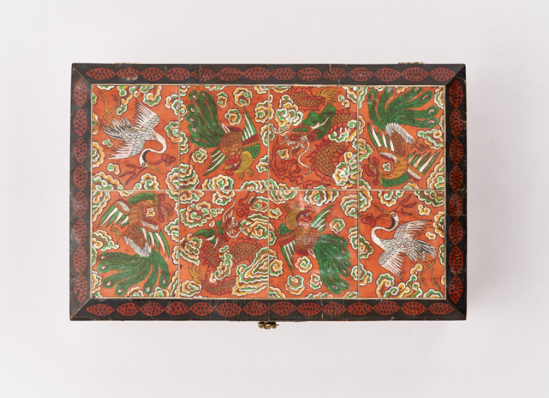 The design motifs on this box have auspicious symbolism. The deer, turtle, and “yeongji” fungus, for instance, are longevity symbols, while the phoenix and peony represent peace, harmony, and prosperity.