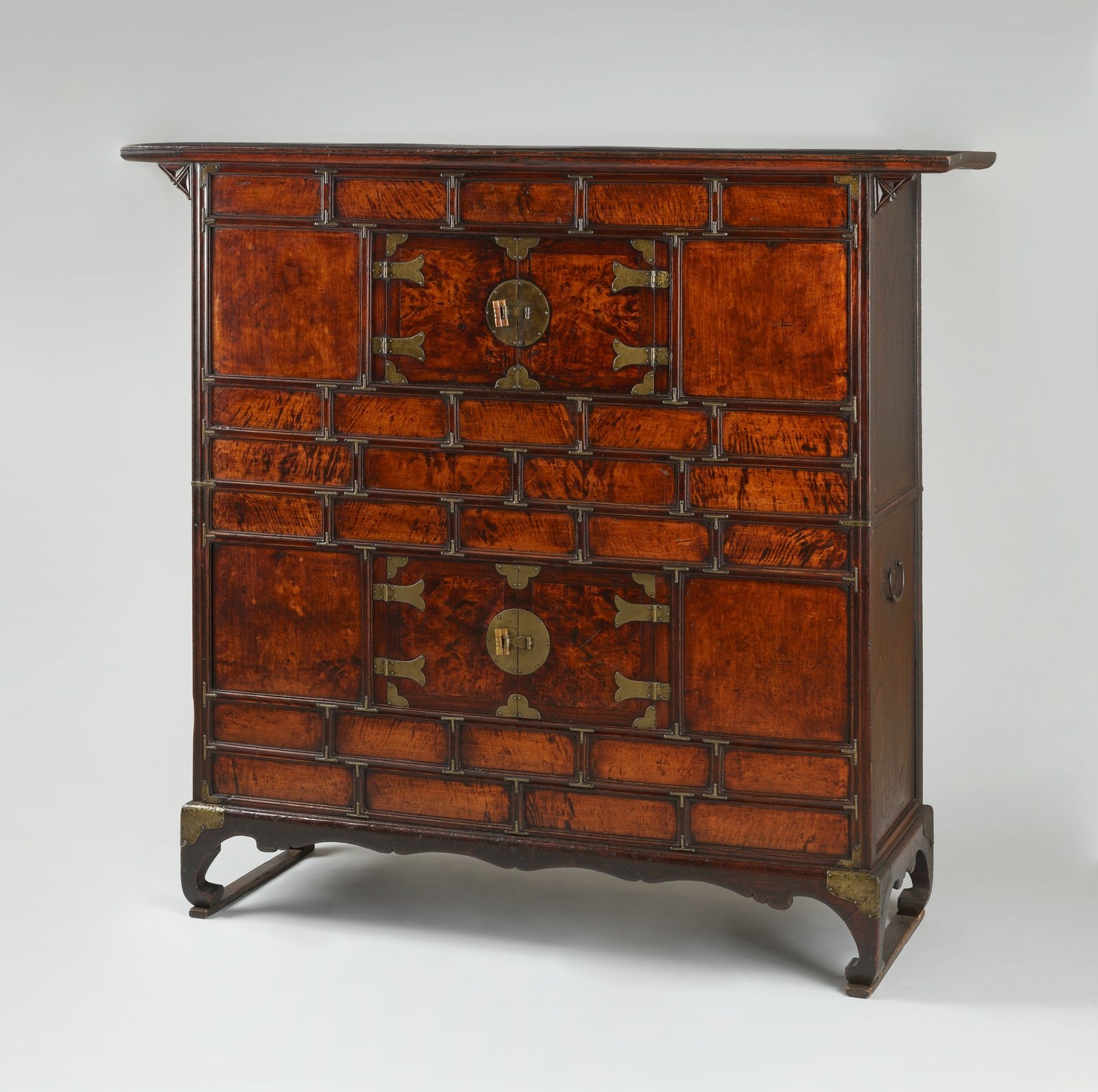 Paulownia & pine wood body, pear wood frame (front), Korean ash wood panels (front), persimmon wood inlay. Yellow brass fittings. Gyeonggi province. Early to mid 19th Century.
