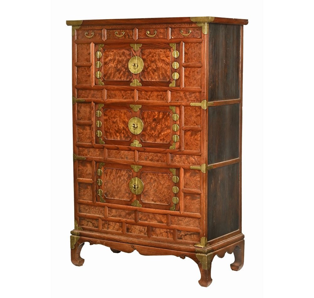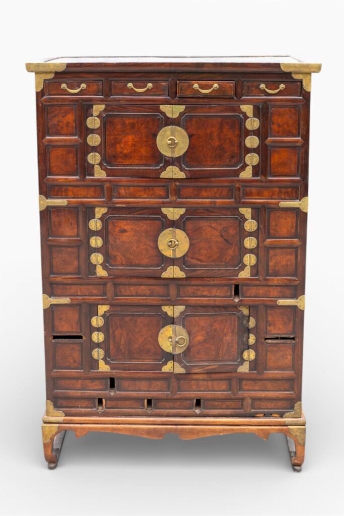 LOT 375A:Korean Burlwood & Brass Bandaji Chest. 19th century four drawers across the top with three sections of double doors below, has brass strap and tack corner mounts, hinges and pulls with round escutcheon plates, on a bracket base with carved apron and feet 65 x 43 x 20 3/4 inches. Fontaine’s Auction Gallery. Pittsfield, MA, US. March 14, 2026. Estimate: $600 USD – $800 USD. Starting bid: $450 USD. SOLD for $450 USD.