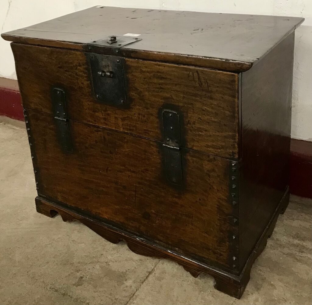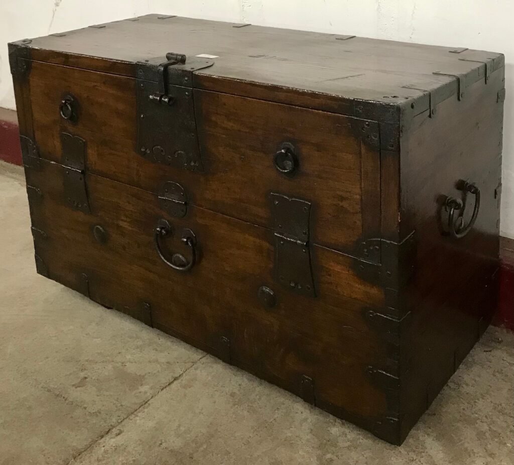 Lot 273: A Korean ‘bandaji’ blanket chest. 83.8 x 96.5 x 48.3 cm. Andrew Jones Auctions. Los Angeles, CA, USA. December 19, 2026. Estimate: $400 USD – $600 USD. SOLD for $110 USD