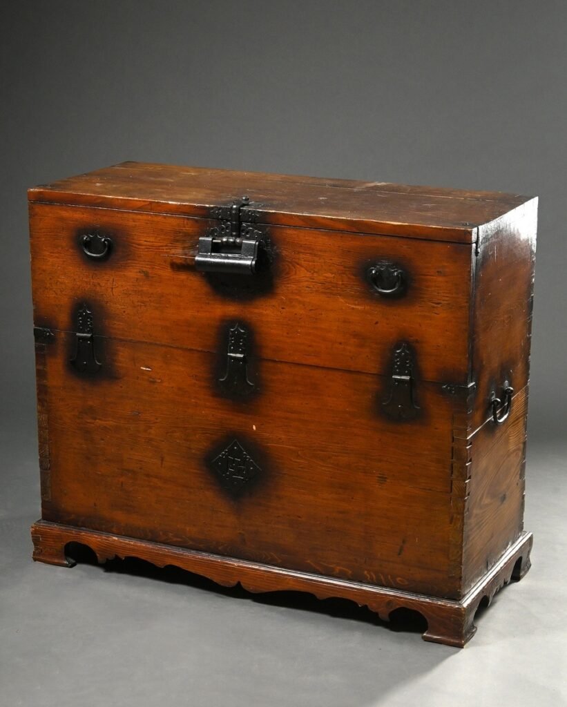 LOT 1191. Bandaji dowry chest in dark-stained elm with iron fittings, front half-opening, Korea circa 1900, 85x109x46cm. Kendzia. Hamburg, Germany. March 28, 2026. Starting bid: €200 EUR. UNSOLD.