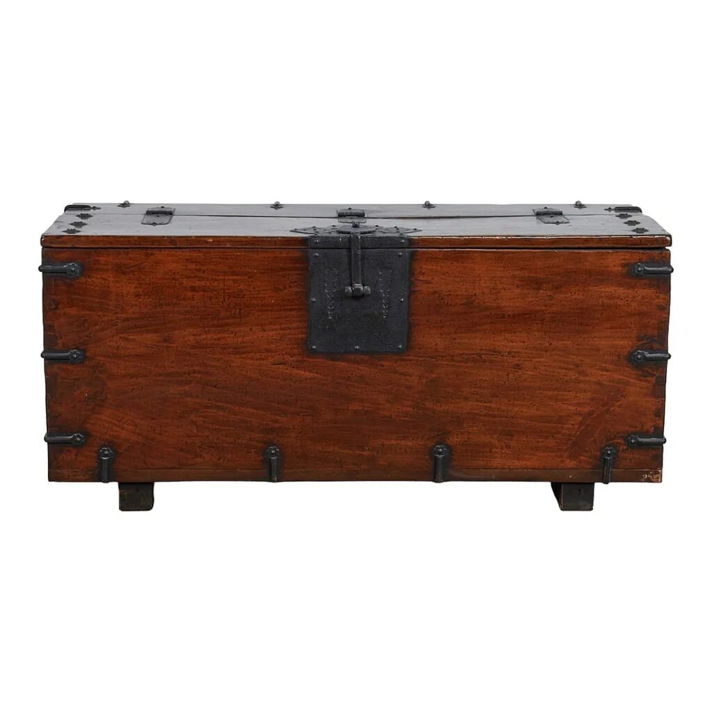 LOT 1676. ASIAN, PROBABLY KOREAN, ELMWOOD COIN CHEST, dovetailed construction with iron bracket reinforcements on the corners, rectangular two-board top hinged front board conceals an open interior, the whole supported by two runner-like feet on the underside. Retains a paper label affixed to the underside, the original iron hardware and the likely original dry finished surface. 19th/early 20th century. H. 19″, W. 45 1/4″, D. 19″. Jeffrey S. Evans & Associates. April 23, 2026. Mt. Crawford, VA, United States. Estimate: $100-$200.- Starting bid: $50.-