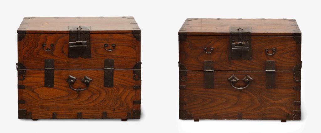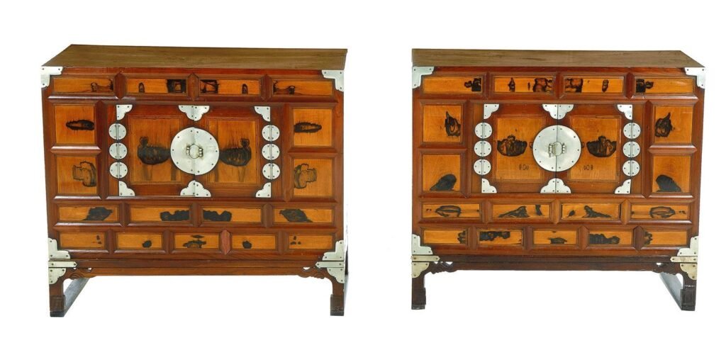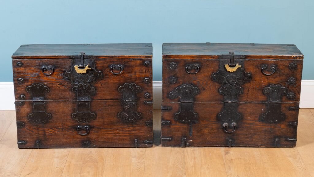 LOT 104. Pair Korean Bandaji Chests 19th century, persimmon or elm, butterfly-like pattern, with hand-forged hardware; H31″ W35 1/2″ D16 1/4″ (2pcs). Charlton Hall. West Columbia, SC, US. March 26, 2026. Estimate: $300 USD – $500 USD. Starting bid: $175 USD. SOLD for $687.5 USD