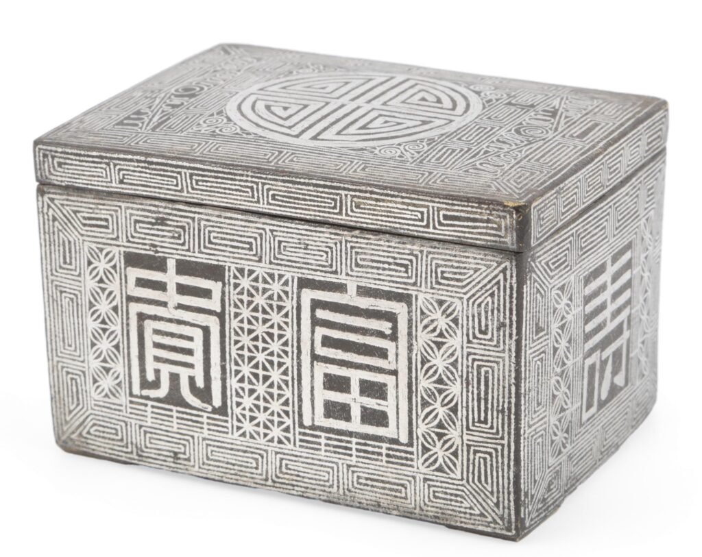 LOT 29. A Korean silver overlaid iron box and cover, 19th century. The cover with Shou medallion, the sides seal script characters, wood lined, width 10.6cm. Gorringes. Lewes, United Kingdom. April 21, 2016. Estimate: £100 GBP – £150 GBP. Starting bid: £50 GBP