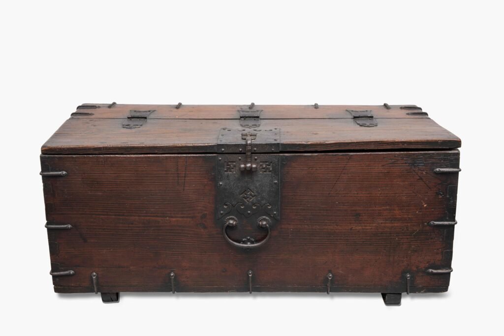 LOT 422:A KOREAN WROUGHT-IRON MOUNTED WOODEN COIN CHEST (TON-KWE), JOSEON, 18/19TH C. 125 x 50 x 46,5 cm. Rob Michiels Auctions. Bruges, Belgium. March 18, 2026. Estimate: €400 EUR – €800 EUR. Starting bid: €300 EUR. SOLD for €450 EUR