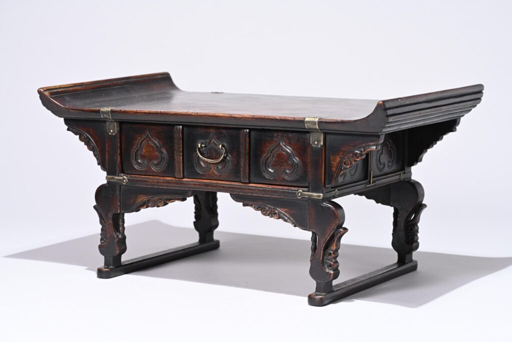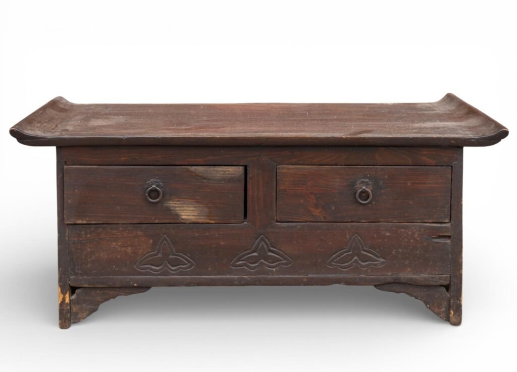LOT 3.19th C Korean Scholar’s Table. crafted from wood, featuring two small drawers with round pull handles. The table shows carved decorative details on the facade and slightly curved edges on its top surface, measures approx. 11″ H x 26″ W x 13″ D. Keystone Auctions LLC. York, PA, US. March 29, 2026. Estimate: $400 USD – $600 USD. Starting bid: $100 USD. SOLD for $300 USD
