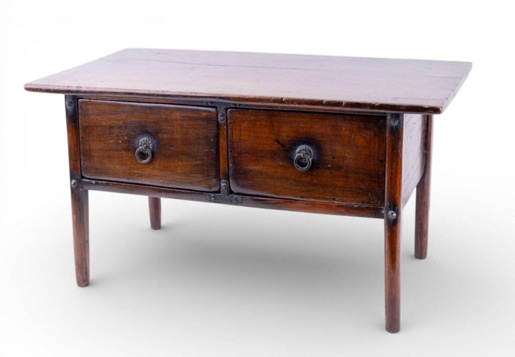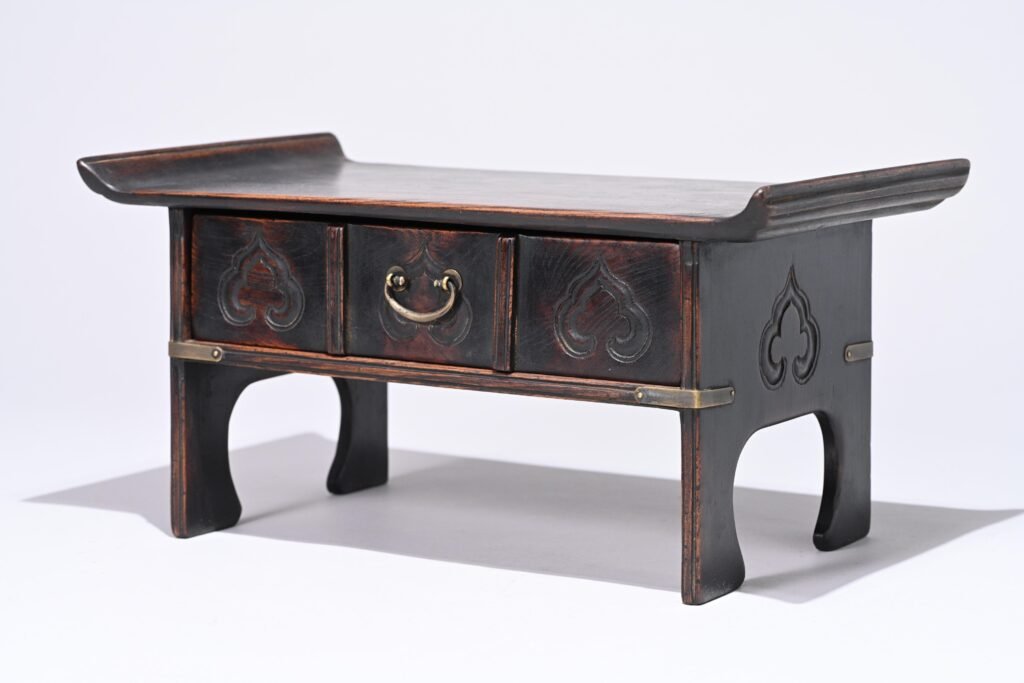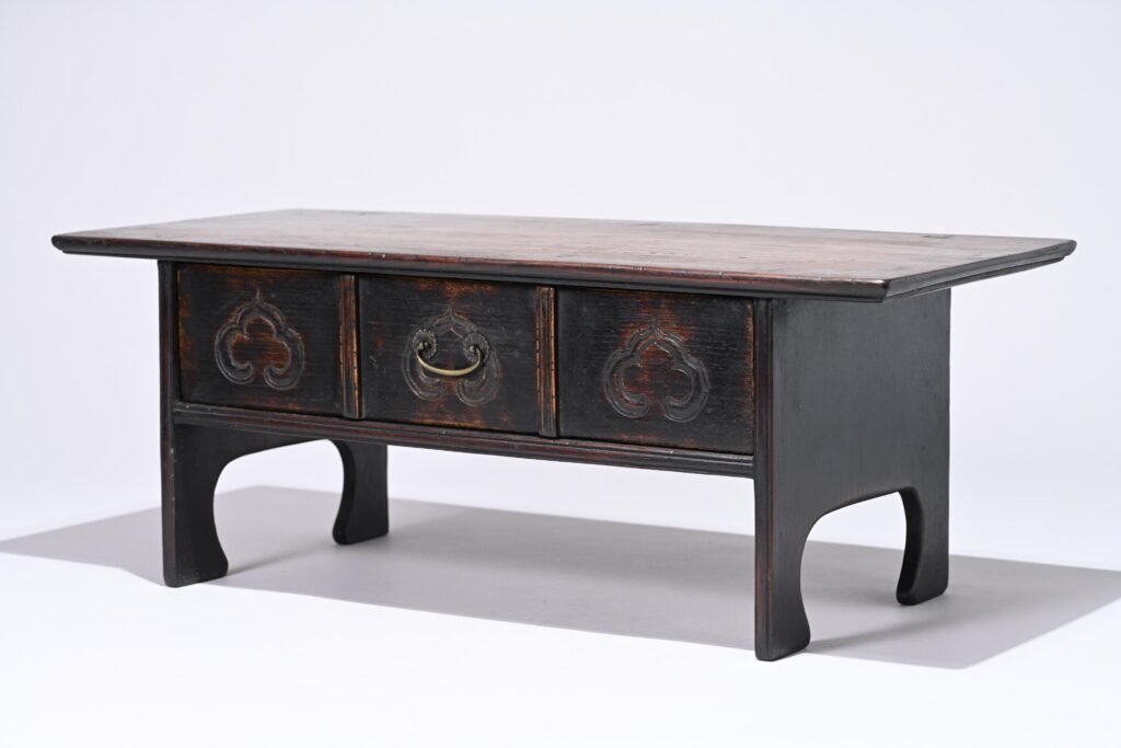 LOT 18.19th C Korean Scholar’s Table. With iron edge details, 2 drawers and iron ring pull handles, note some loss, measures approx. 21.25″ W x 12.25″ D x 11.5″ H. A low-profile wooden desk used by Confucian scholars for reading, writing, and calligraphy while sitting on the floor. Keystone Auctions LLC. York, PA, US. March 29, 2026. Estimate: $400 USD – $600 USD. Starting bid: $100 USD. SOLD for $250 USD
