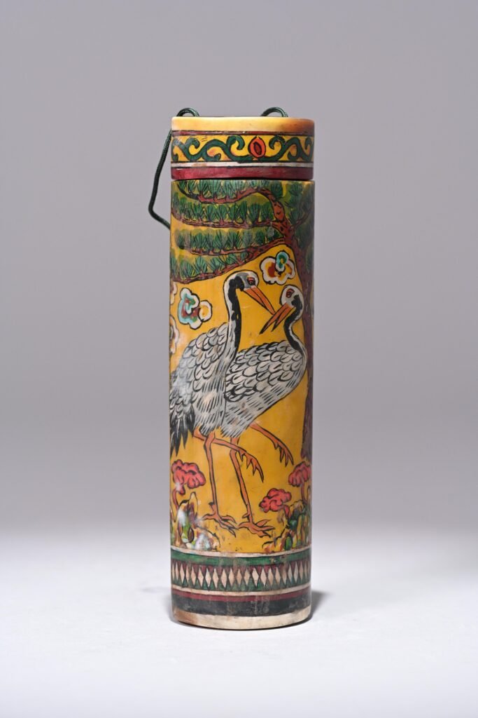 LOT 318.A HORN INLAID INCENSE TUBE WITH DEER AND CRANE DESIGN, JOSEON DYNASTY. L. 18.6cm; D. 5.3cm; 121g. Fukuoka Yumekai Auction. Osaka, Japan. April 18, 2026. Starting bid: ¥100,000 JPY