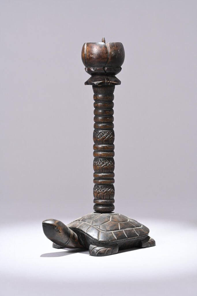 LOT 319.A WOODEN TURTLE FORM CANDLE STAND, JOSEON DYNASTY. H. 31cm; 378g. Fukuoka Yumekai Auction. Osaka, Japan. April 18, 2026. Starting bid: ¥10,000 JPY