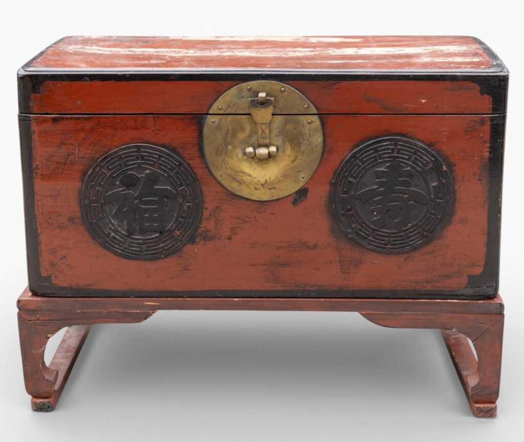 LOT 13.19th C Korean Red Lacquer Box on Frame. Featuring a royal red finish with circular embossed motifs on the front panel. The box has a brass circular lock plate with latch closure and sits atop a coordinating lacquered wood stand. Brass hinges are present on the back.. Measures approx. 23.25″ x 17.25″ x 12″. Keystone Auctions LLC. York, PA, US. March 29, 2026. Estimate: $200 USD – $400 USD. Starting bid: $100 USD. SOLD for $300 USD