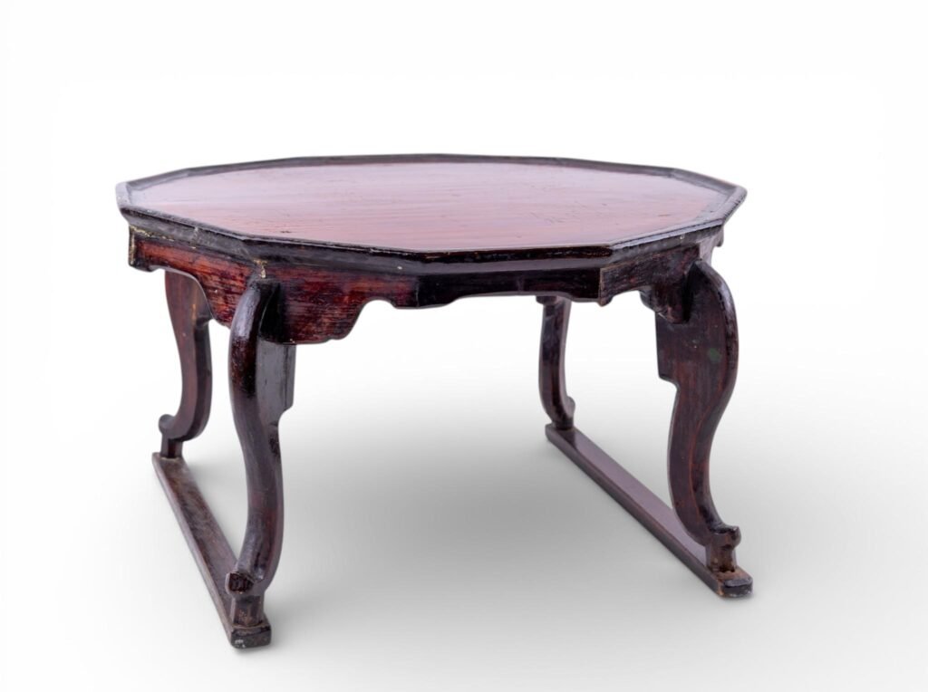 LOT 16.Antique Korean Soban Table. Used as personal table, constructed of carved, lacquered wood, note wear from age and use. Measures approx. 17″ W x 16.5″ D x 10″ H. A Soban table was historically for each household member to have their own portable dining table, reflecting Confucian values of individual respect. Keystone Auctions LLC. York, PA, US. March 29, 2026. Estimate: $100 USD – $200 USD. Starting bid: $50 USD. SOLD for $50 USD