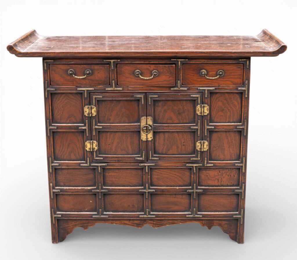LOT 8. Antique / 19th century Korean / Asian head chest crafted from wood, featuring intricate paneling on the front, brass hardware accents, and a decorative central latch on the double-door cabinet. Includes 4 upper drawers with matching brass pulls. Measures approx. 38″ H x 38.5″ W x 18″ D. A/K/A a Morijang was a small cabinet designed to be placed beside the bed in a room. Keystone Auctions LLC. York, PA, US. March 29, 2026. Estimate: $300 USD – $500 USD. Starting bid: $100 USD. SOLD for $150 USD