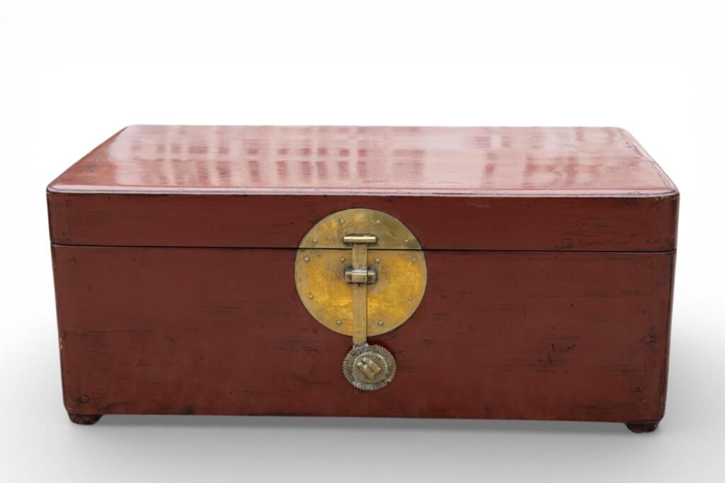 LOT 232. A Chinese lacquer chest with brass mounts. 65cm wide 34cm deep 36cm high. For-Auction. Sydney, Australia. January 26, 2026. Estimate: Est: $80 AUD – $120 AUD. Starting bid: $40.- SOLD for $90 AUD. Note: This is a Korean wedding box.