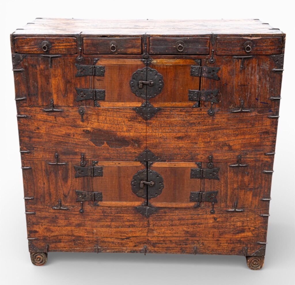 LOT 23.19th C Korean Jeon-Ju Chest with Iron Hardware. measuring 40.25 H x 40 W x 19.5 D. Constructed from wood with iron hardware, featuring four small upper drawers and two larger compartments with hinged front doors. The chest displays side-mounted iron carrying handles. Keystone Auctions LLC. York, PA, US. March 29, 2026. Estimate: $400 USD – $600 USD. Starting bid: $200 USD. SOLD for $275 USD