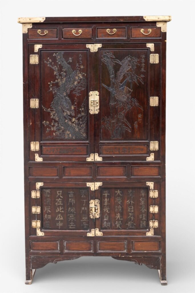 LOT 29.19th C Korean Clothing Chest w/ Carved Poem. including flowering trees and birds, along with calligraphy inscriptions / poem and drawings. The chest includes upper drawers, hinged doors with brass hardware, and a stepped base. Measures approx. 64.5″ H x 35″ W x 17.5″ D. Linen press / wardrobe. Keystone Auctions LLC. York, PA, US. March 29, 2026. Estimate: $1,000 USD – $1,200 USD. Starting bid: $300 USD. SOLD for $11,500 USD