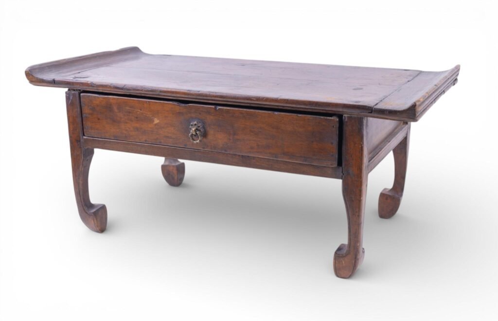 LOT 32.19th C Korean Scholar’s Table. Carved wood, 1-drawer table with brass ring pull in the center of the drawer. Note table will require repairs to the joints on the left side under the top. Measures approx. 24.5″ W x 12.5″ D x 10.5″ H. Keystone Auctions LLC. York, PA, US. March 29, 2026. Estimate: $600 USD – $800 USD. Starting bid: $300 USD. SOLD for $450 USD
