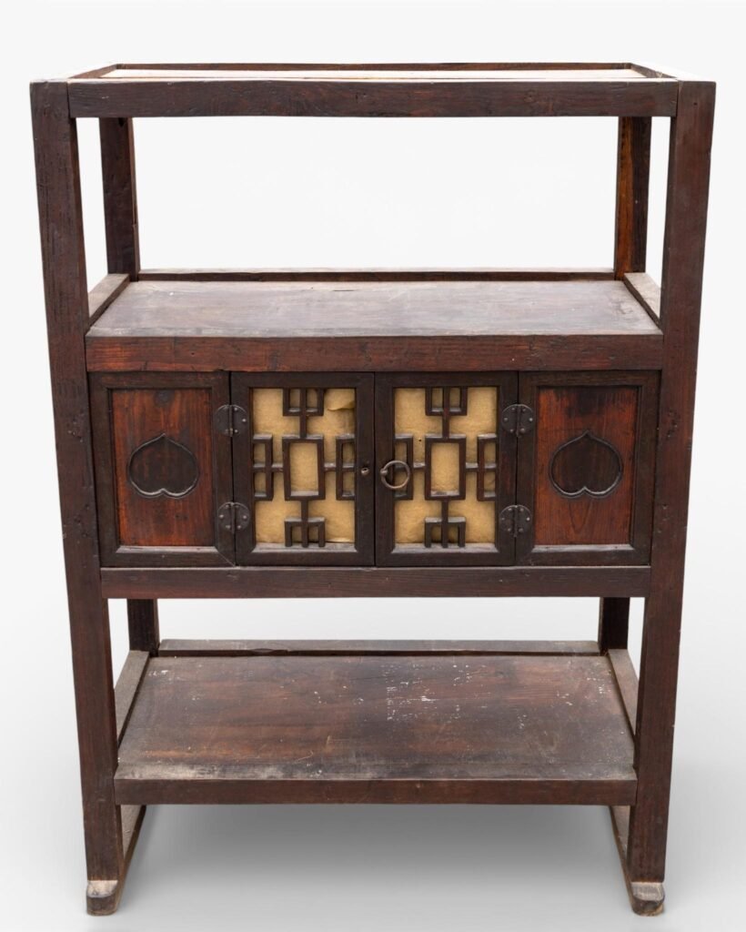LOT 34.19th C Korean Kitchen Cabinet. Constructed from wood, featuring an open shelf at the top and an enclosed section in the center with hinged doors. The cabinet doors showcase decorative iron hardware and geometric cutouts backed by fabric. A lower shelf provides additional storage. Measures approx. 58″ H x 40″ W x 15″ D. Keystone Auctions LLC. York, PA, US. March 29, 2026. Estimate: $1,400 USD – $2,000 USD. Starting bid: $300 USD. UNSOLD.