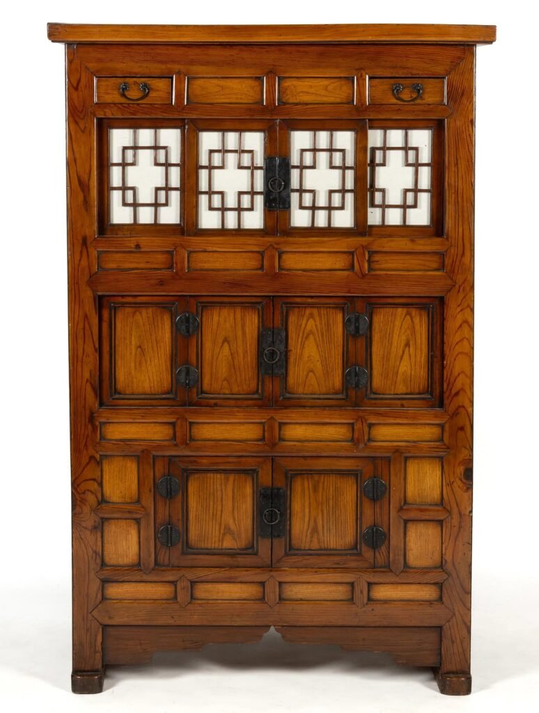 LOT 1674. KOREAN ELMWOOD AND PINE CHANJANG / KITCHEN CABINET, the overhanging molded cornice over two short drawers, sliding parchment-lined doors, and two sets of hinged cabinet doors, the whole flanked by paneled ends and raised on short runner-like feet on either end. Retains the original brass hardware and the likely original finished surface. First half/mid 20th century. H. 63″, W. 41″, D. 25 1/4″. Jeffrey S. Evans & Associates. April 23, 2026. Mt. Crawford, VA, United States. Estimate: $200-$300.- Starting bid: $100.-