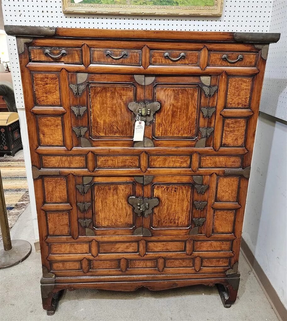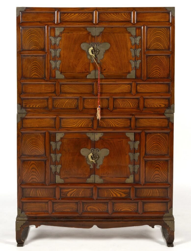 LOT 1673. KOREAN ELMWOOD TANSU WEDDING CABINET, two-piece form, the upper case with numerous rectangular panels surrounding two raised-panel doors with distinctive brass butterfly hardware, the lower case is nearly identical to the top but with an applied shaped bracket foot base. Pine secondary wood. Retains an old, probably original, finished surface with warm color. First half/mid 20th century. H. 52 3/4″, W. 34 1/4″,D. 14 3/4″. Jeffrey S. Evans & Associates. April 23, 2026. Mt. Crawford, VA, United States. Estimate: $200-$300.- Starting bid: $100.-