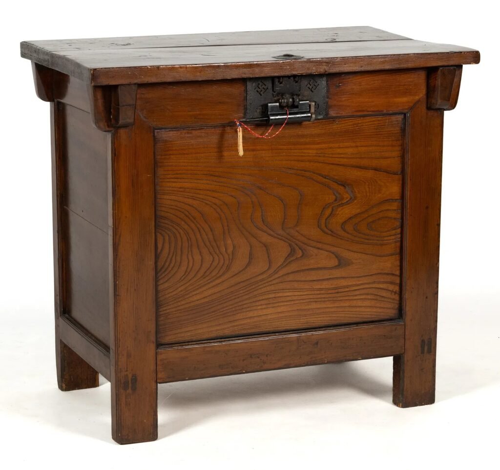 LOT 1672. KOREAN ELMWOOD AND PINE RICE CHEST, the rectangular top with a fixed backboard and a removable front board which reveals an open interior, the case of post and panel construction with a fielded panel on the front and each end. Retains an old finished surface with warm color. Pine secondary wood. First half/mid 20th century. H. 38″, W. 41 1/4″, D. 25″. Jeffrey S. Evans & Associates. April 23, 2026. Mt. Crawford, VA, United States. Estimate: $200-$300.- Starting bid: $100.-