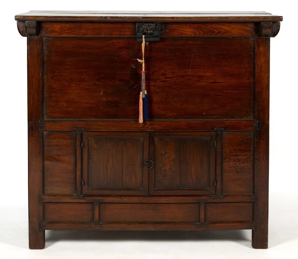 LOT 1675. KOREAN ELMWOOD AND PINE LARGE RICE / STORAGE CHEST, the rectangular top with a fixed backboard and a removable front board which reveals an open interior, over two hinged fielded-panel cabinet doors. Retains an old finished surface with warm color. Pine secondary wood. First half/mid 20th century. H. 47 1/2″, W. 52 3/4″, D. 26 3/4″. Jeffrey S. Evans & Associates. April 23, 2026. Mt. Crawford, VA, United States. Estimate: $200-$300.- Starting bid: $100.-