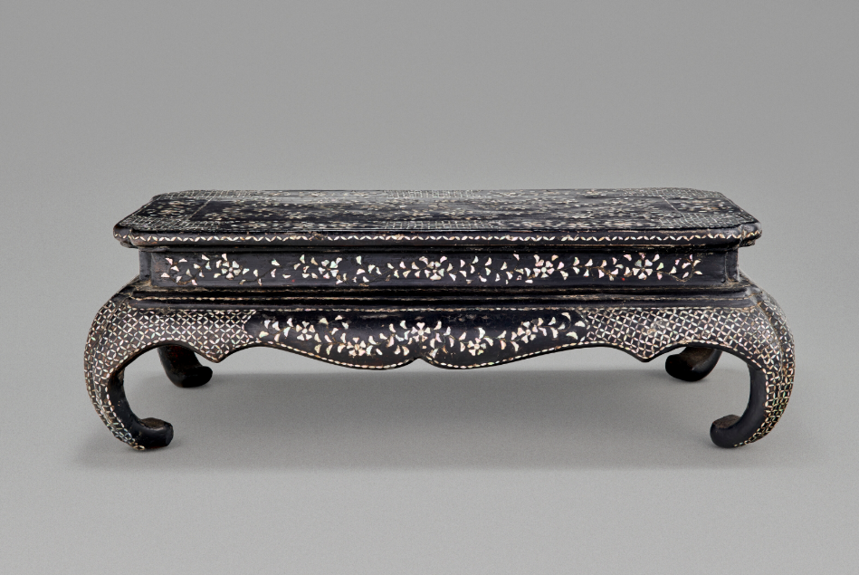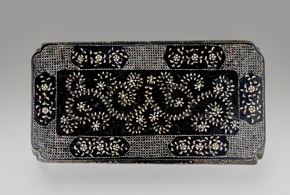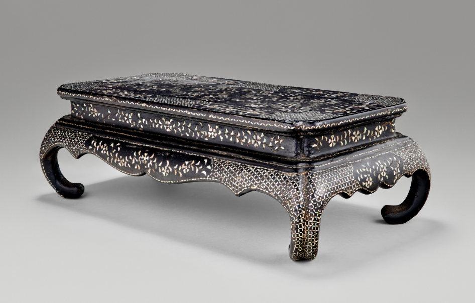 LOT 154. A MOTHER-OF-PEARL INLAID LACQUER LOW TABLE JOSEON DYNASTY (17TH CENTURY). The rectangular table set on four short inward-curving legs, decorated on top and sides in inlaid mother-of-pearl and brass wires with floral scrolls of chrysanthemum and floral latticework on black lacquer ground, applied with black lacquer on the interior 10 7⁄8 x 23 3⁄8 x 7 ¾ in. (27.6 x 59.4 x 19.7 cm.) Estimate: USD 15,000 – USD 20,000.- CHRISTIE’S JAPANESE & KOREAN ART. New York. March 24, 2026. UNSOLD.