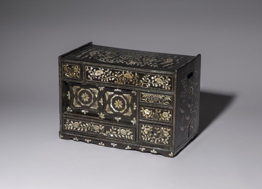 LOT 47. Joseon dynasty small chest with flower design in Mother-of-Pearl inlay H. 31.7 x W. 45.8 x D. 26.2cm. Mainichi Auction. Sale 846. Asian Antiques Main Sale. TOC Ariake West Tower 5F, Ariake 3-5-7, Koto Ward 135-0063 Tokyo April 11, 2026. Estimate: JPY 300,000 – 500,000. (€1,631 – 2,718) UNSOLD.