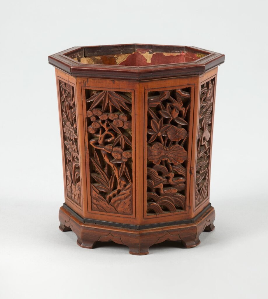 Lacquer box with plum tree, bird, bamboo, chrysanthemum and arabesque design.