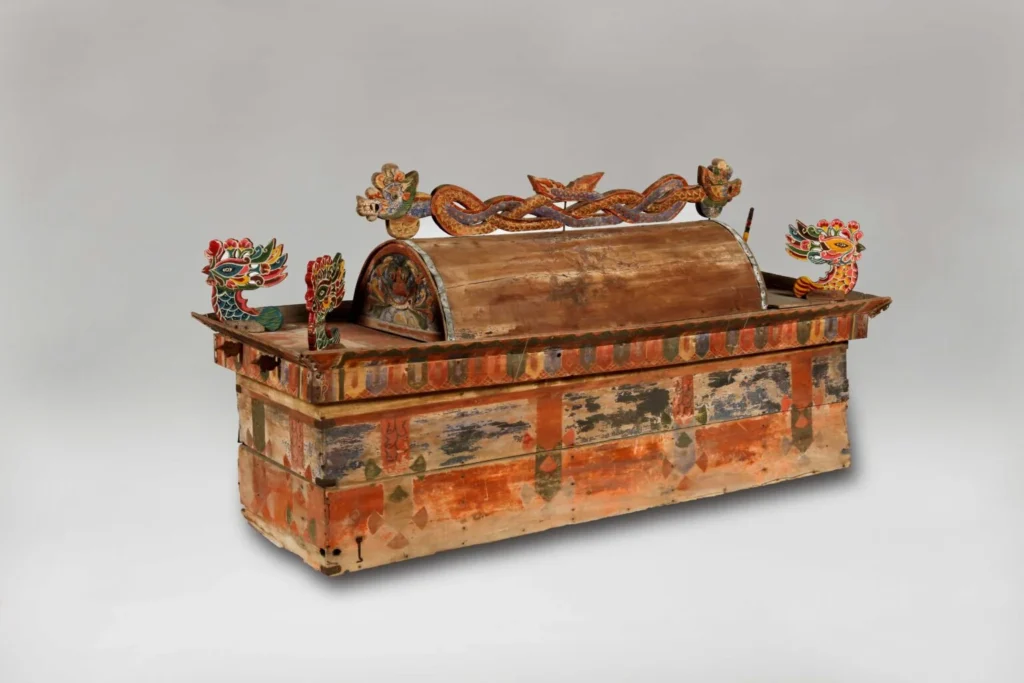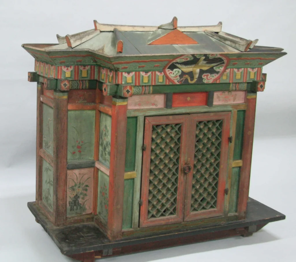 Temple furniture could be painted with red, green, blue and gold. Patterns echoing temple decoration were used on offering tables, sutra chests or cabinets for ritual implements.