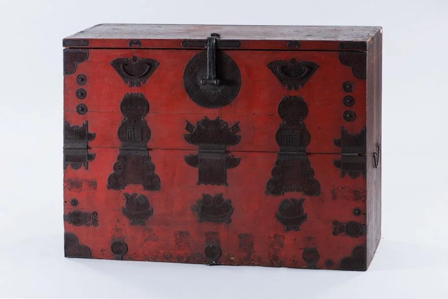 Folk chests often favored strong, warm colors, unlike Neo-Confucian aristocratic pieces that emphasized natural wood and restraint. Bright red and orange finishes were especially common in rural and island regions, including Baeknyeongdo, Heuksando, Jeju, and parts of Hwanghae Province. Because of this, such pieces are typically classified as regional folk furniture rather than yangban elite work.