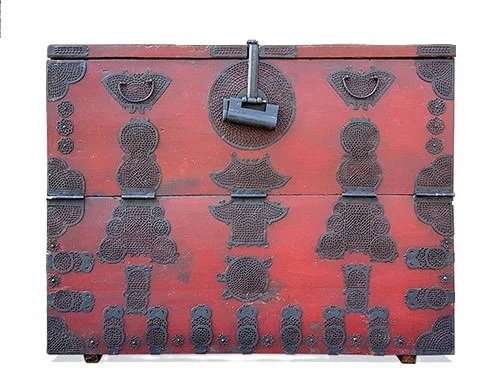 Red pigment also helped conceal mixed or lower-grade woods like pine or linden, while giving the chest a richer appearance suited to dowry or marriage furnishings, often seen on common wedding boxes. The color further enhanced the contrast with iron hardware. The chest in your image, with its dense stamped iron fittings and matte red surface, aligns closely with styles from Baeknyeongdo and the western islands of Hwanghae Province.