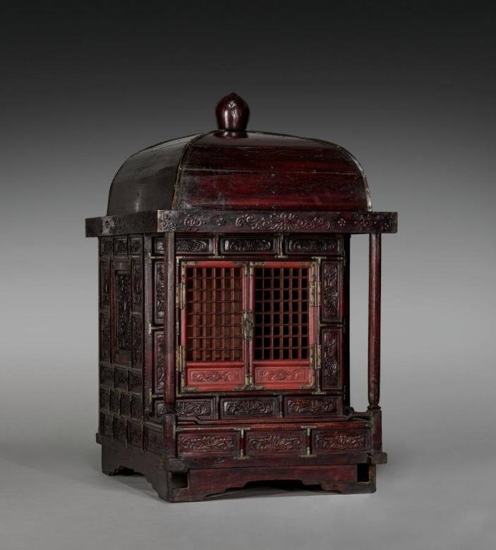 Consisting of a body a pedestal and a roof, this tabernacle has two compartments inside, indicating that two spirits where enshrined. Collection: National Museum of Korea, Seoul.